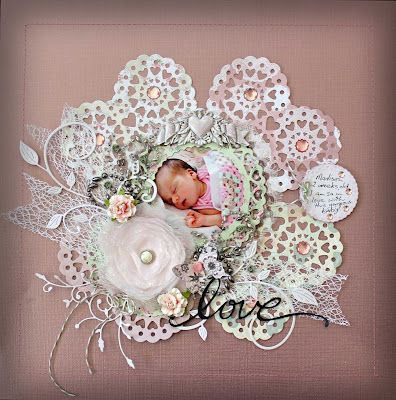 I couldn't resist the heart doily and papers from the Vintage notes range, to use on layouts of my new little granddaughter!